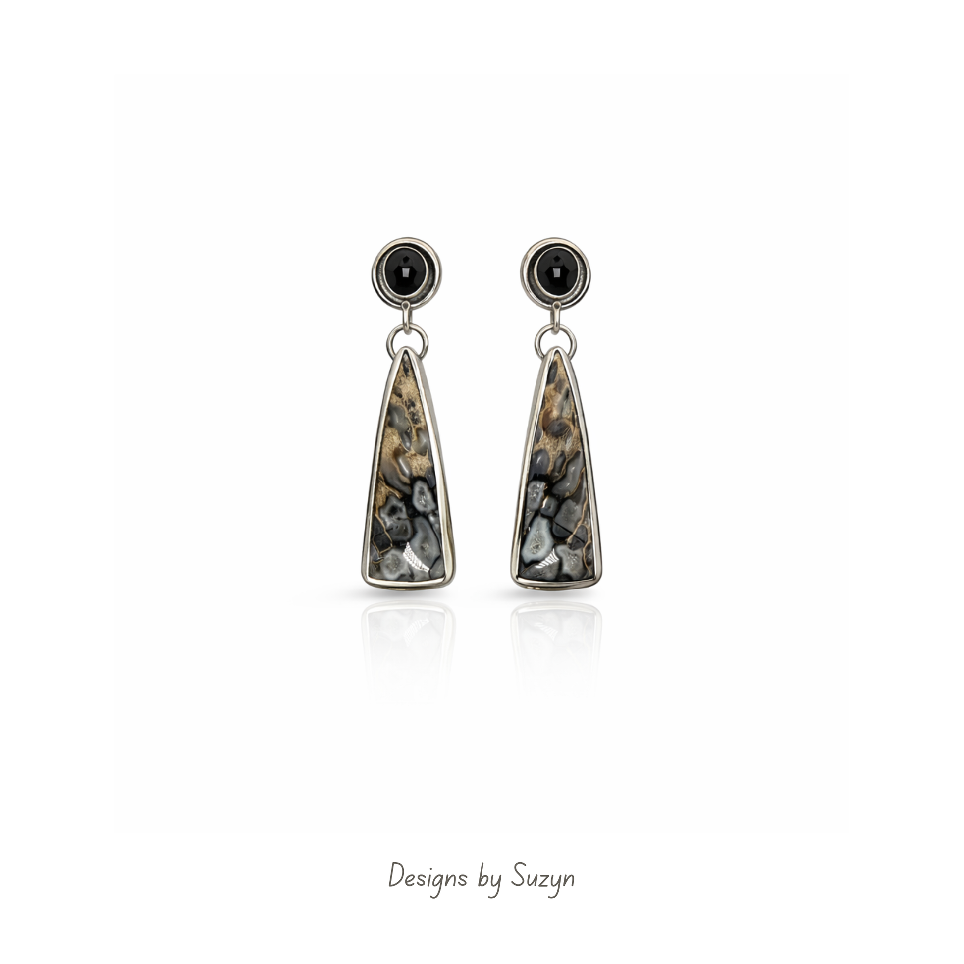 Title of piece: Black Spinel & Petrified Wood Earrings – Petra